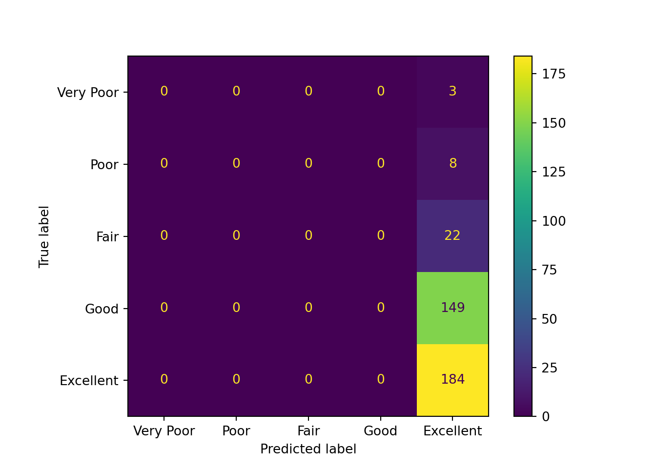 Additionally, as expected, the baseline dummy model only predicts the “Excellent” class.